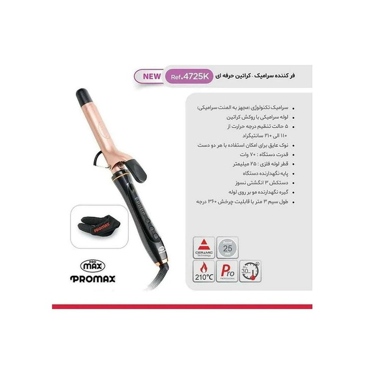 مدت زمان گرمشدن: ۳۰ ثانیه - سر عایق حرارت - قطر استوانه: ۲۵ میلیمتر - ۵ دمای قابل تنظیم از ۱۱۰تا ۲۱۰ درجهی سانتیگراد - دارای نشانگرهای دما - پایه فلزی با روکش نسوز - گیره نگهدارنده مو - کلیدهای تنظیم درجه حرارت - دستکش سه انگشتی نسوز